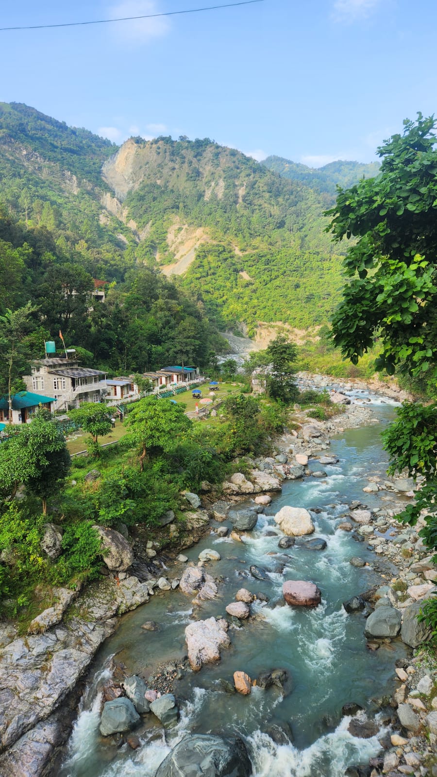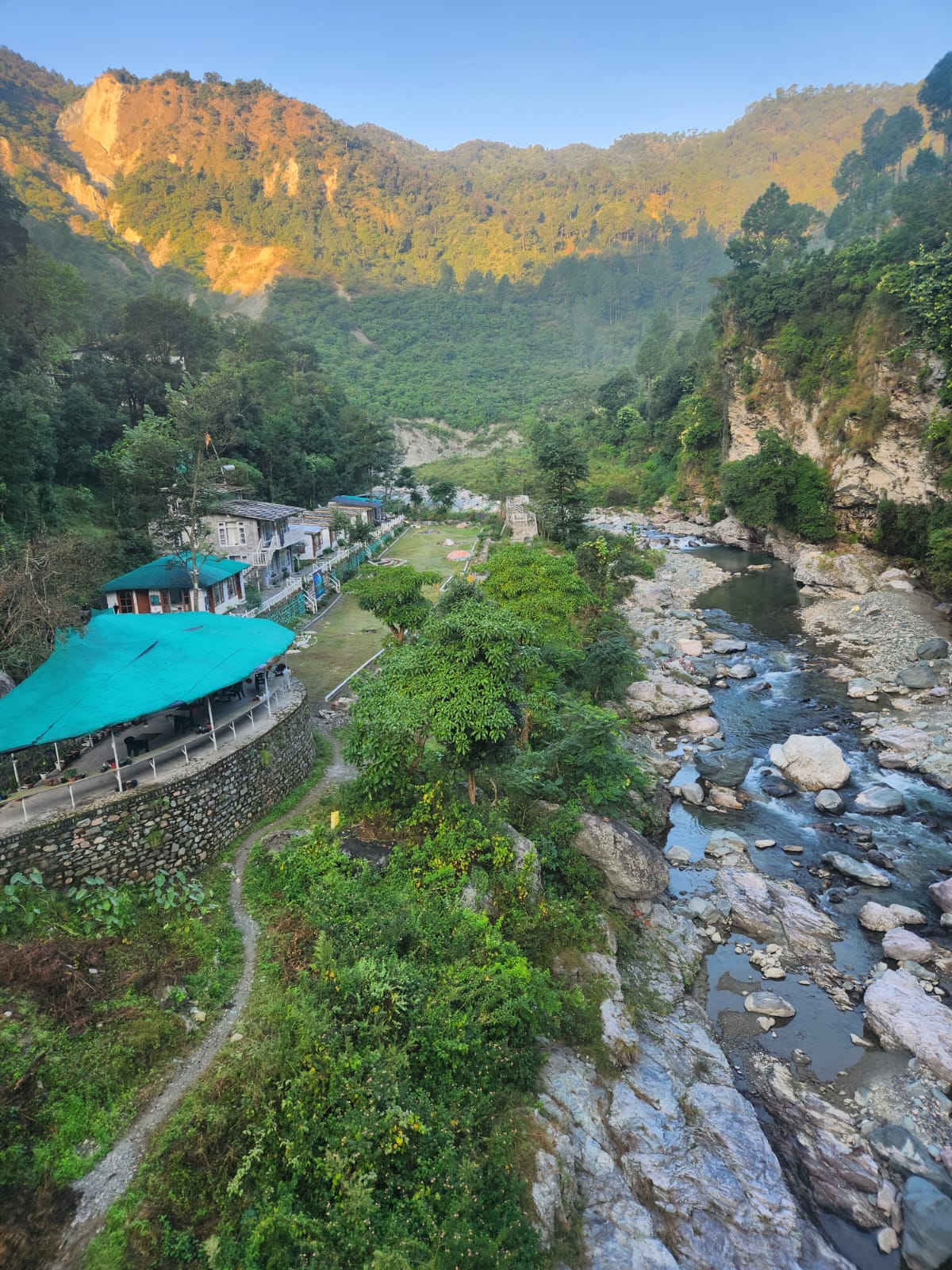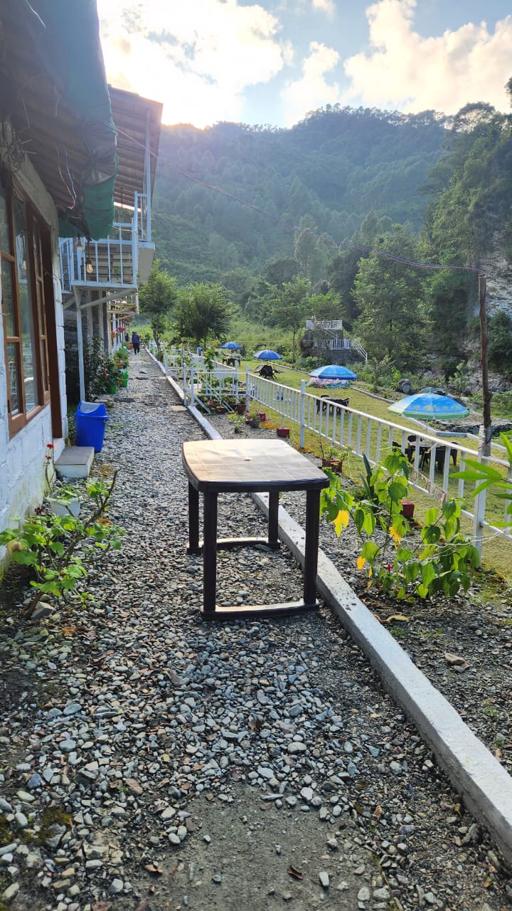 Sitting at the resort, guests can keep enjoying the views of the mountains with the bubbly sound of the river. The beauty and the feel of the resort changes with the changing sun. With setting sun, a cooler breeze from the river and the bonfire makes it worth spending time. The evenings at the resort is peaceful.